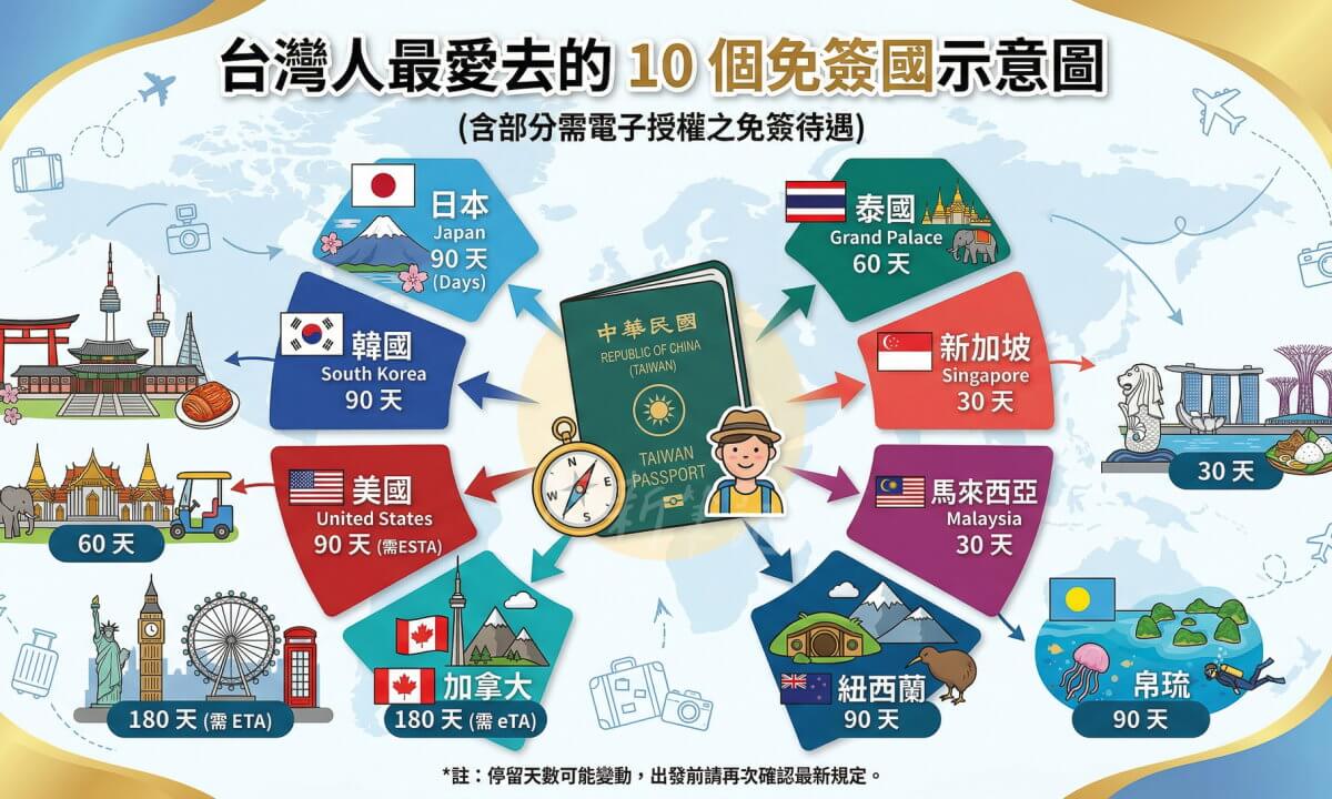 截至 2026 年 3 月,台灣護照可以免簽證前往 108 個國家、落地簽 31 國、電子簽 53 國,合計 192 個國家與地區。台灣護照在全球排名第 33 位。日本、韓國、泰國、新加坡、歐洲申根區都是免簽,美國需申請 ESTA、加拿大需…